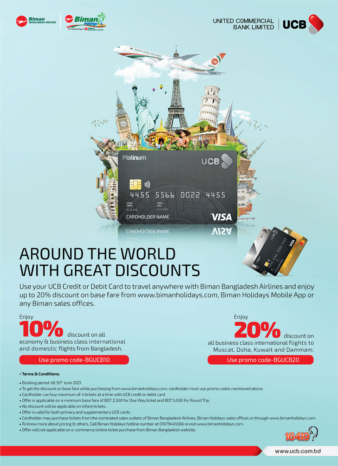 Discount offer for UCB Debit and Credit Cardholders from Biman Bangladesh Airlines sales offices and Bimanholidays.com