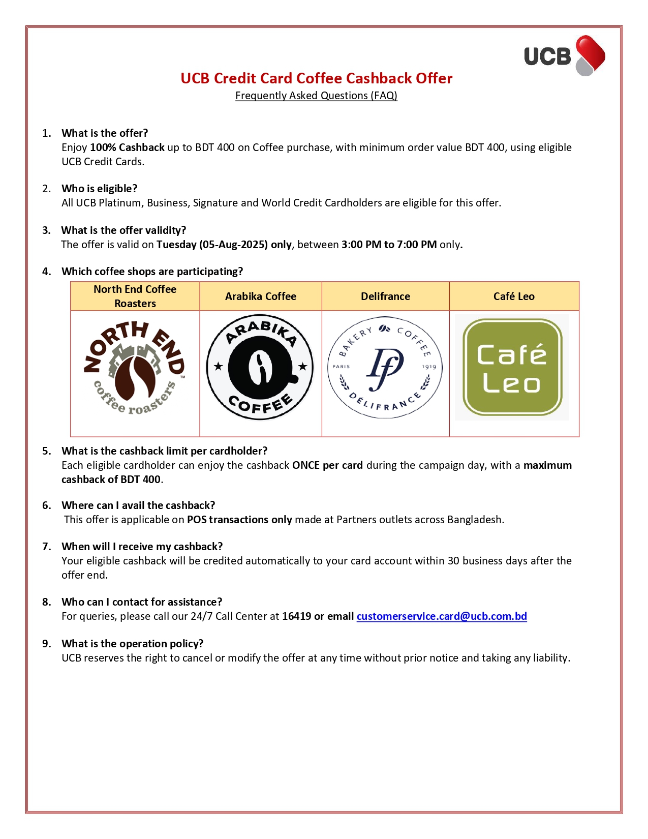UCB Credit Card Coffee Cashback Offer August 2025