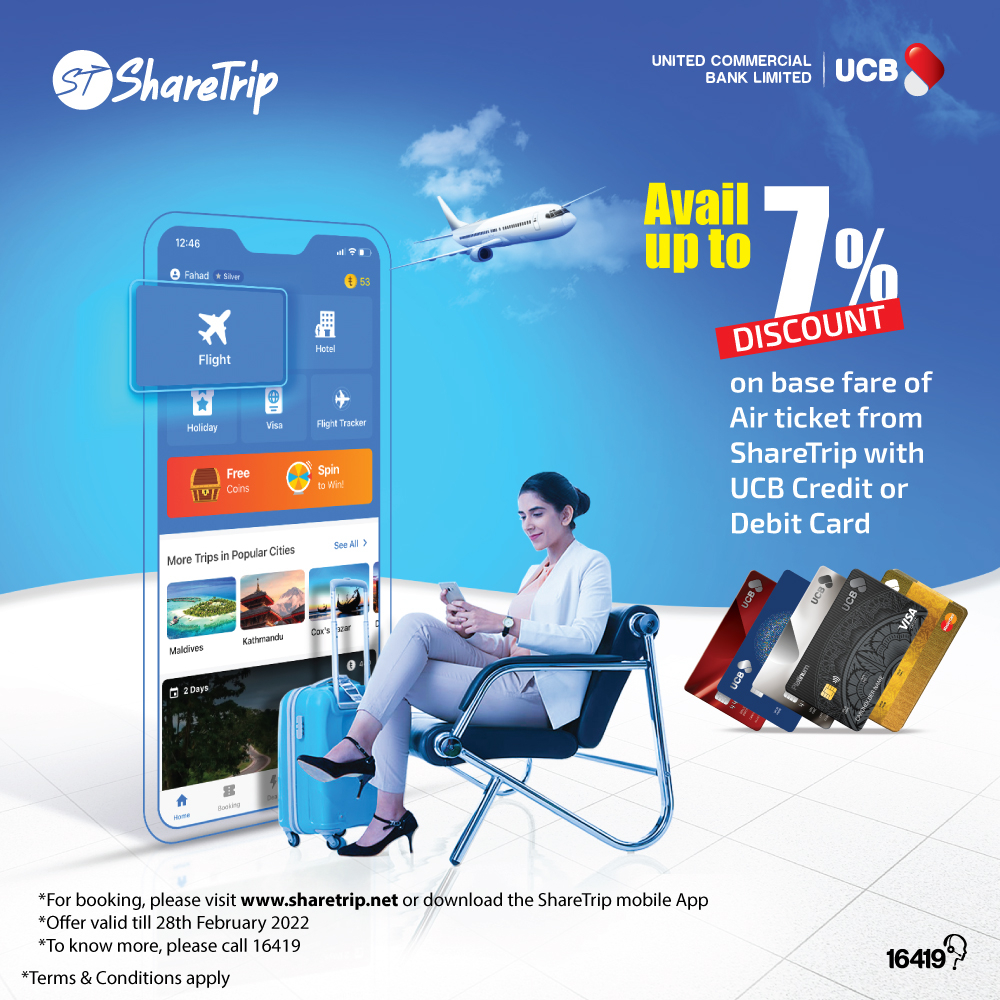 Up to 7% discount on base fare of Air Ticket from Sharetrip for UCB Credit and Debit Cardholders