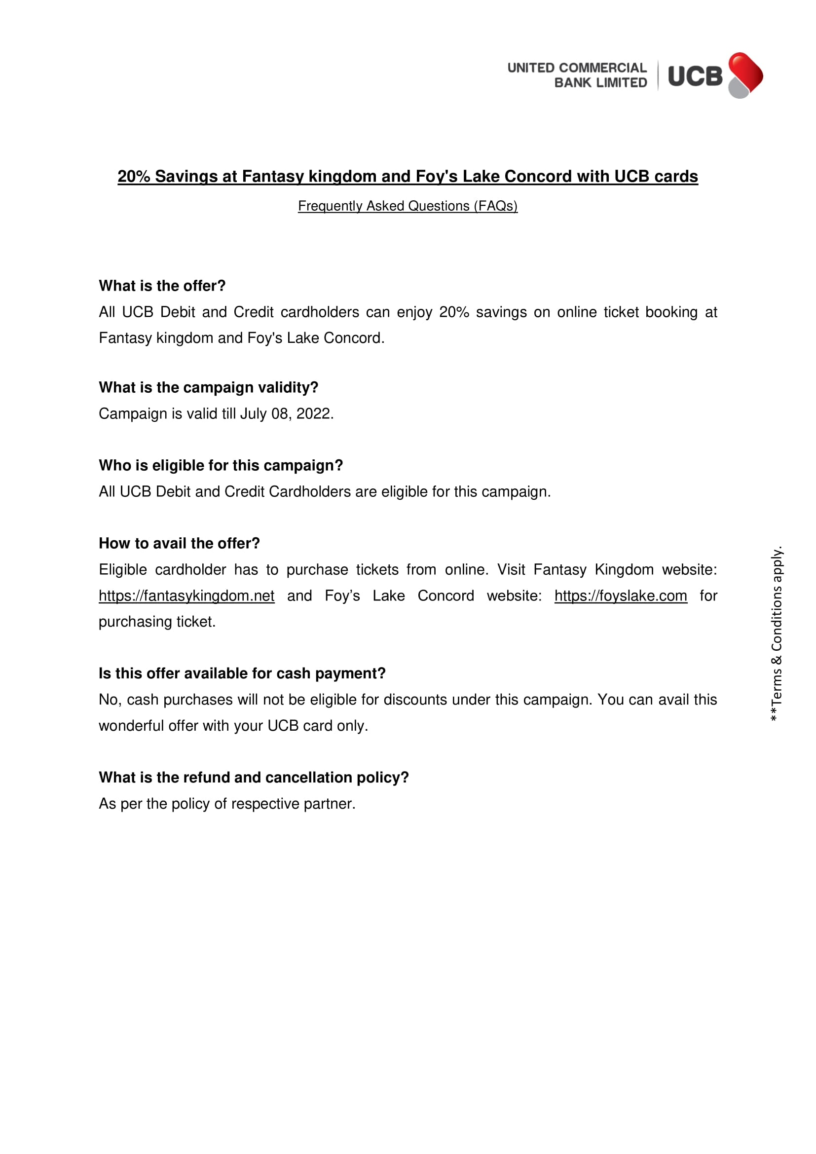 FAQ: 20% Savings at Fantasy kingdom and Foy's Lake Concord with UCB Cards