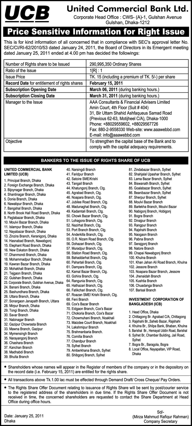 Price Sensitive about record date of Right issue entitlement - 24.01.2011