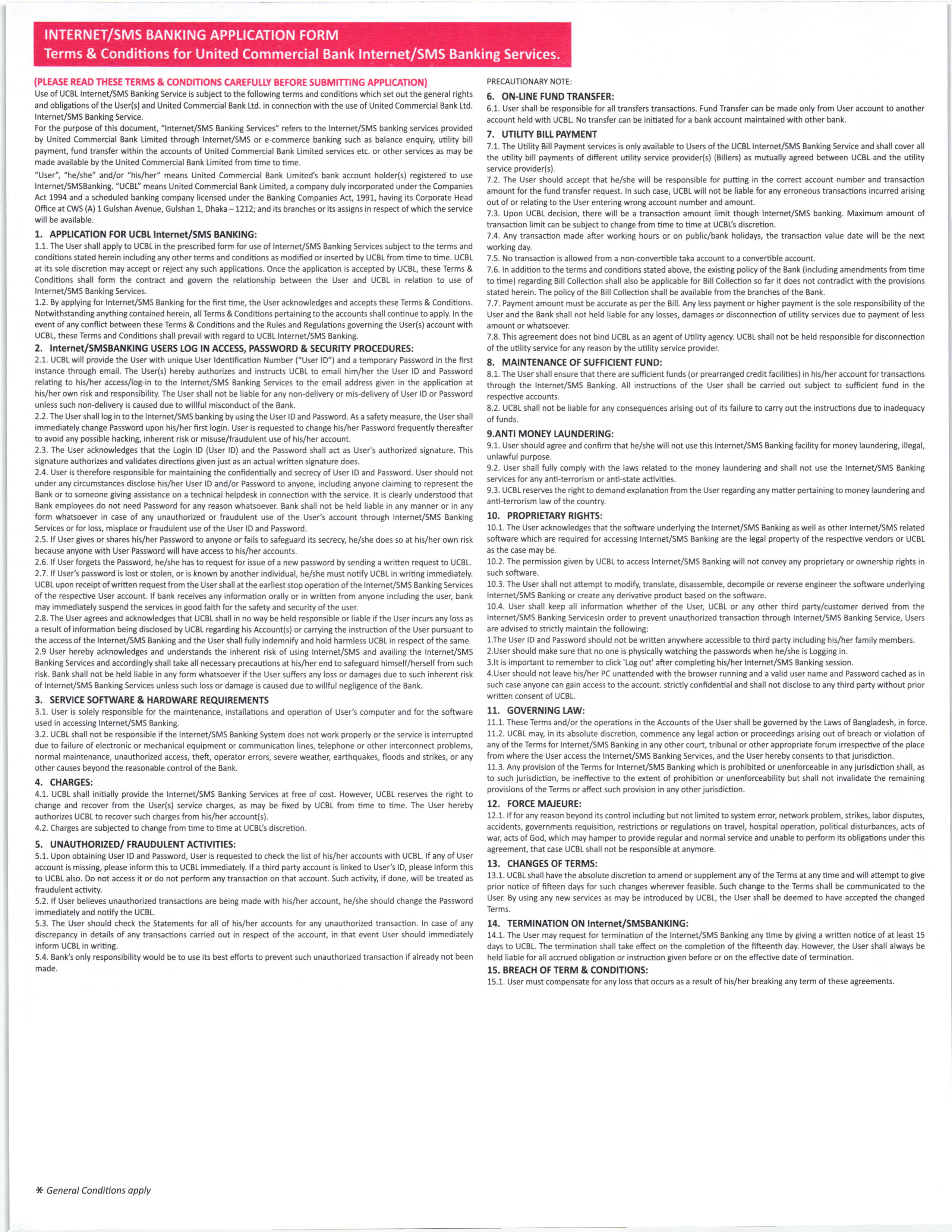 Terms & Conditions for UCBL iBanking/SMS Banking Services